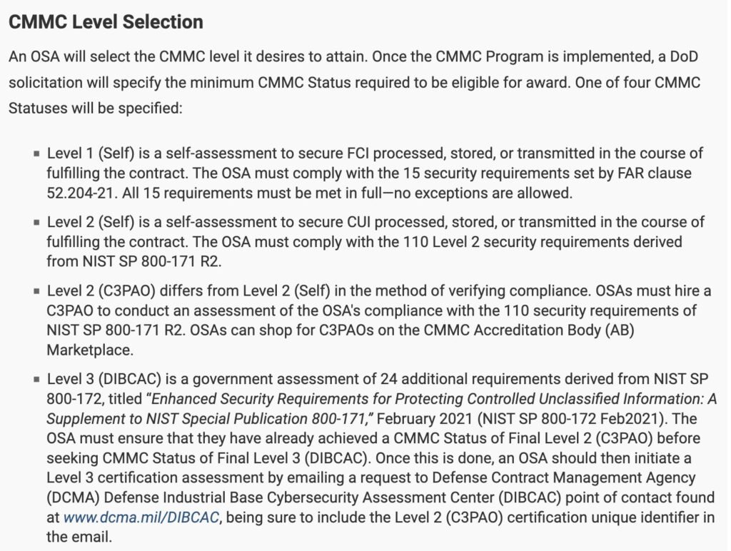 Similarly, CMMC also uses NIST SP 800-171 requirements (already applicable under DFARS 252.204-7020) as the backbone for Level 2 status. There, the contractor (or subcontractor) must, either through a self-assessment or through a third party inspection, meet the 110 requirements in NIST SP 800-171 (Revision 2).
